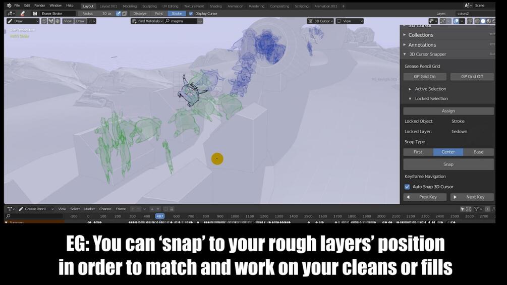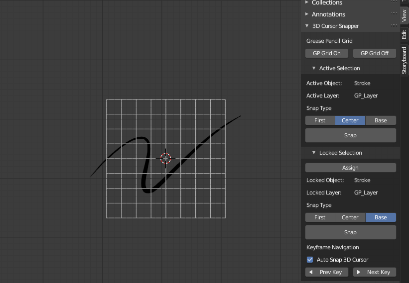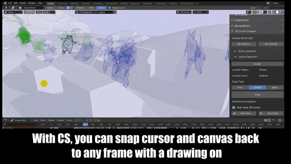 Cursor-Snapper is a Blender add-on designed to help create 3D Grease Pencil animations. It allows snapping the 3D cursor back to a previous Grease Pencil location.